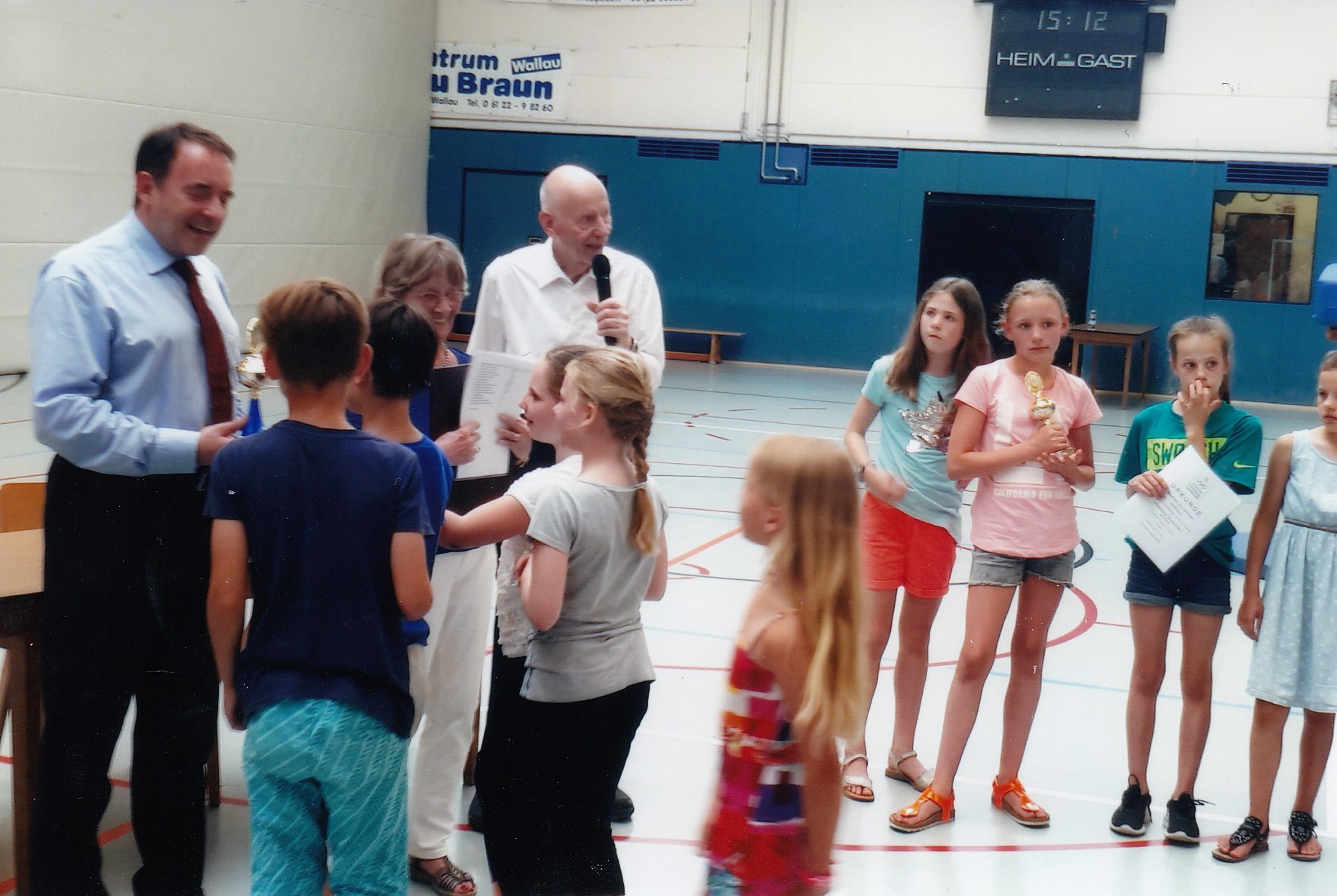 Mit diesen drei Worten eröffnete der Hessische Kultusminister Prof.Dr.Alexander Lorz die Übergabe der Pokale, Urkunden und Wanderpreise an die 25 Wiesbadener Grundschulen, die erfolgreich an den Wettkämpfen JUGEND TRAINIERT FÜR OLYMPIA im Schuljahr 2017/18 teilgenommen haben. Zuvor hatte bereits die Schulleiterin der Grundschule Breckenheim Monika Prager die etwa 250 Schülerinnen und Schüler, Lehrerinnen und Lehrer sowie Eltern und Ehrengäste, die zu dieser 30.Ehrungsfeier gekommen waren, herzlich begrüßt. Der besondere Gruß galt dabei natürlich Staatsminister Prof. Dr.Lorz, aber auch der Stadtverordnetenvorsteherin Christa Gabriel, dem Wiesbadener Oberbürgermeister Sven Gerich, dem Vorsitzenden des Ausschusses Freizeit und Sport Rainer Pfeifer, dem Sportamtsleiter Karsten Schütze, Dr.Frank Obst als Bereichsleiter Schule des Landessportbundes Hessen, dem Schulsportreferenten Jürgen Gräber, dem Vizepräsidenten der Deutschen Olympischen Gesellschaft Norbert Lamp, Klaus Paul und den Mitgliedern des Ortsbeirates Breckenheim. Die Grundschule hatte zusammen mit dem Turnverein die Ausrichtung dieser Feierstunde in der Sport- und Kulturhalle übernommen, zu der regelmäßig am Ende eines Schuljahres von der Stadtgruppe Wiesbaden der Deutschen Olympischen Gesellschaft eingeladen wird. Beim Eintreffen des Ministers sang der Schulchor den Breckenheimer Schulsong. Nach der Begrüßung zeigten zwei Gruppen der Videoclip-Tänzerinnen, was sie unter der Leitung von Liane Schulz einstudiert hatten. Dann aber war es soweit und der Vorsitzende der DOG-Stadtgruppe Hans-Jürgen Portmann konnte die ersten aller 16 Siegerschulen aufrufen, um vom Minister Pokale und Urkunden entgegen zu nehmen. Diese hatten für Teilnahmen und Leistungen mindestens 50 Punkte erreicht und in ihren Gruppen es bis zum 4.Platz geschafft. Nach diesem ersten Ehrungsblock zeigten Grundschülerinnen des Radsportvereins Breckenheim unter der Leitung der ehemaligen FSJlerin Marie Elter ihr Können auf dem Einrad, was mit viel Beifall belohnt wurde. Es folgten dann die Höhepunkte der Veranstaltung. Die 3. und 2.platzierten Schulen bekamen ihre Siegerpokale, dann wurden die Schulen aufgerufen, die jeweils den 1.Platz belegt hatten und dafür auch noch die großen Wanderpreise der Deutschen Olympischen Gesellschaft erhielten. Es waren dies bei den großen Schulen über 300 Schülerinnen und Schüler zum ersten Mal die Europaschule Dr.Obermayr, bei den Schulen mit 151 bis 300 Kindern wie im Vorjahr die Grundschule Nordenstadt und schließlich bei den kleinen Schulen bis 150 Schülerinnen und Schülern zum 30.Mal in Folge die Grundschule Breckenheim. Das war natürlich einen besonderen Beifall wert. Dazu überreichte noch der Vizepräsident der DOG Norbert Lamp an Diplom-Sportlehrer Helmut Koch, der in allen 30 Jahren stets die Mannschaften der Grundschule Breckenheim aufgestellt und geformt hat, die Ehrenplakette der DOG. Allen ausgezeichneten Schulen dankte dann der Oberbürgermeister Sven Gerich, der sich freute, in seiner Stadt so viele kommende Talente zu haben. Den Abschluss bildete schließlich noch eine Vorführung auf dem Trampolin mit Grundschulkindern der Breckenheimer Turngruppe unter der Leitung der FSJlerin Pia Born. Es war wie in den Vorjahren eine gelungene Feierstunde, die den besonderen Stellenwert des Grundschulsports erneut deutlich machte.